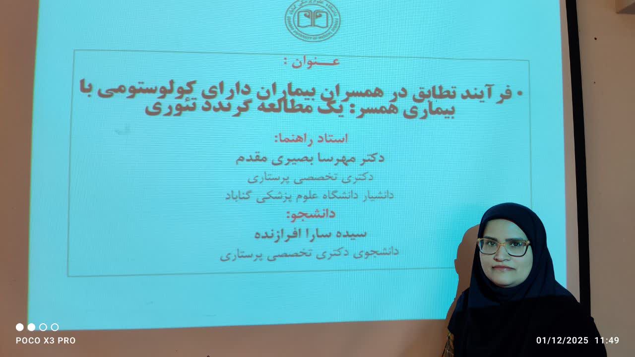 جلسه دفاع از عنوان پایان نامه خانم سیده سارا افرازنده دانشجوی دکتری تخصصی پرستاری با موضوع "فرآیند تطابق در همسران بيماران داراي کولوستومی با بيماري همسر: یک مطالعه گرندد تئوري" به راهنمایی سرکار خانم دکتر مهرسا بصیری مقدم در دانشکده پرستاری برگزار گردید. در این جلسه، عنوان پژوهشی پیشنهادی ارائه و ابعاد مختلف آن شامل ضرورت انجام پژوهش، اهداف، سؤالات تحقیق و روششناسی مورد نظر تشریح شد.